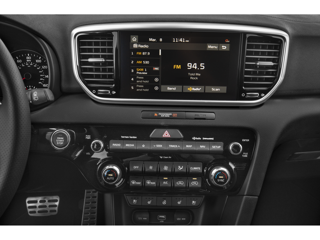 - Radio: AM/FM/MP3 Premium Audio System -inc: 320 Watts, 8" touchscreen, UVO link, navigation, harman/kardon sound system, 8 speakers including subwoofer and tweeters, Clari-Fi digital audio restoration, SiriusXM satellite radio, additional USB port, Bluetooth® wireless technology, voice control, Android Auto and Apple CarPlay